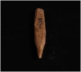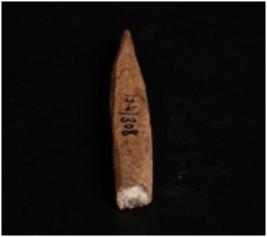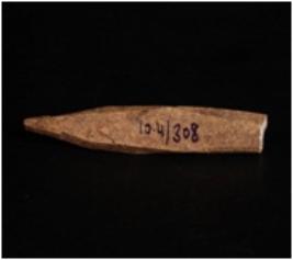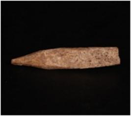 | Description / विवरण | Bone point with flattened surface and tapered on one end, Tip of one side is pointed broken from another side, rectangular in section and polished surface. |