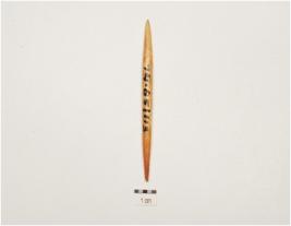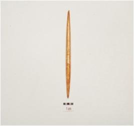 | Description / विवरण | A point made on bone, polished surface, pointed one end other end is tanged though pointed and circular cross section. |