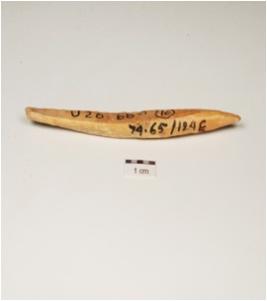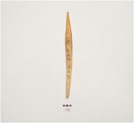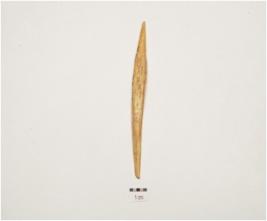 | Description / विवरण | A bone point, facated polished surface, one intact pointed end and irregular circular cross section. |