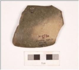 | Description / विवरण | Fragment of a basalt harvester with sharp edge having perforation on one end and polished surface. |