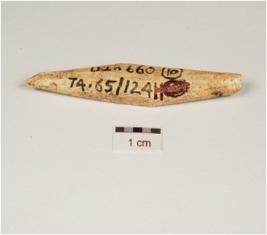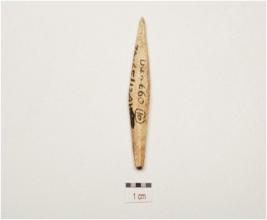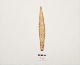 | Description / विवरण | A bone point, facated polished surface, one intact pointed end and irregular circular cross section. |