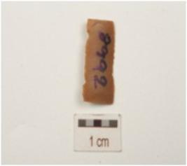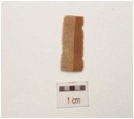 | Description / विवरण | Fragment of a blade, made of chert, prepared platform, bulb absent, broken along distal end, use-wear marks along the cutting edges, triangular in section and ridge on dorsal side. |