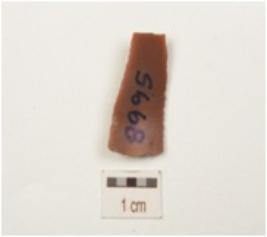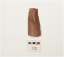 | Description / विवरण | Fragment of a blade, made of chert, broken along both ends use-wear marks along the cutting edges, triangular in section and ridge on dorsal side. |