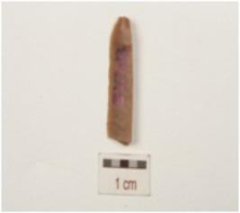 | Description / विवरण | Fragment of a blade, made of chert, diffused bulb on ventral side, prepared platform, use-wear marks along the cutting edge, ridge on dorsal side, triangular in section and broken along the distal end. |