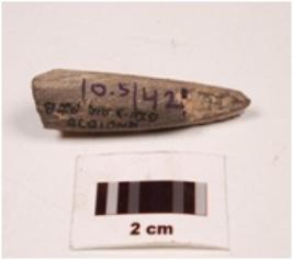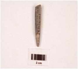 | Description / विवरण | Fragment of pointed arrow bead stone, plano convex in section, greyish colour, smooth surface. |