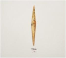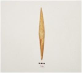 | Description / विवरण | A bone point, facated polished surface, both intact pointed ends and irregular circular cross section. |