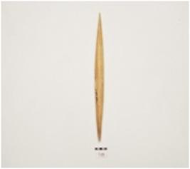| Description / विवरण | A bone point, facated polished surface, both intact pointed end and irregular circular cross section. |