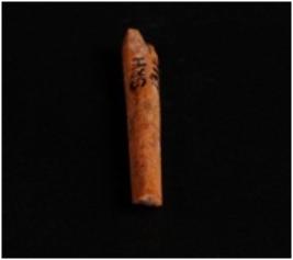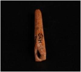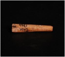 | Description / विवरण | Bone needle long narrow, circular in section, smooth and polished surface, brown in colour, broken from both ends, uneven shape and eye on top. |