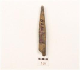 | Description / विवरण | A fragment of point made on bone, broken upper part and slightly broken tip, circular cross section. |