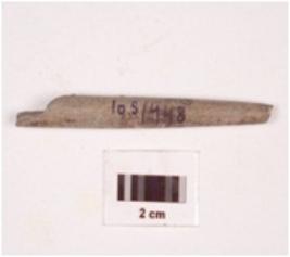 | Description / विवरण | Fragment of pointed arrow head stone, circular in section, damaged one end greyish colour, smooth surface. |
