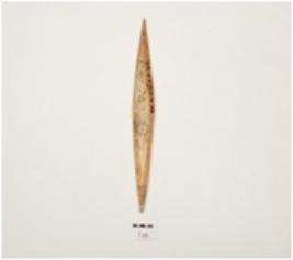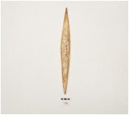 | Description / विवरण | A bone point, facated polished surface, both intact pointed ends and irregular circular cross section. |