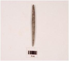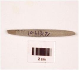 | Description / विवरण | Fragment of pointed arrow head stone, rectangular in section, greyish colour, smooth surface. |