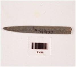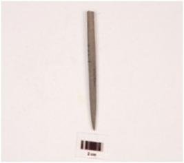| Description / विवरण | A point made on himalayan soft stone with polished surface, circular in section and broken from the thick end. |