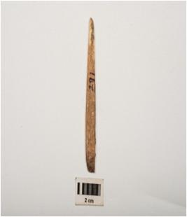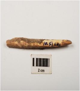 | Description / विवरण | Bone point with smooth surface and polished towards pointed end, partly broken from both ends, oval in section and earthy incrustation on surface. |