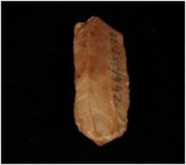 | Description / विवरण | Chert blade, double ridge on the dorsal, bulb is present, distal end is broken, useware marks along the cutting edge and trapezoidal section. |