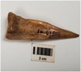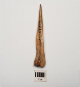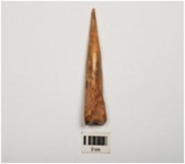 | Description / विवरण | Bone awl, polished and glossy surface with a thick, broad end, slightly broken at pointed end with cracks irregular section. |