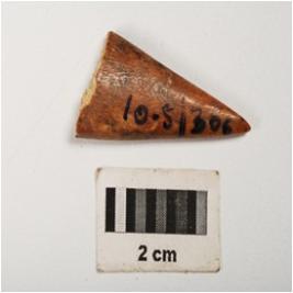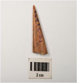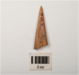 | Description / विवरण | Fragment of bone arrowhead, polished surface with a pointed end, brown in colour and rectangular in section from other broken end. |