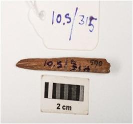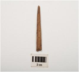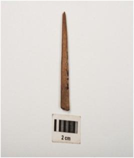| Description / विवरण | Fragment of bone point with smooth surface and polished towards partly broken pointed end, broken at thick end, incised line and grain on surface, oval in section. |