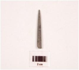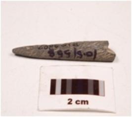 | Description / विवरण | An elongated stone point, natural incised lines on surface, pointed tip, broken from bottom, rectangular in section, polished surface. |