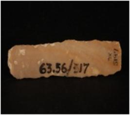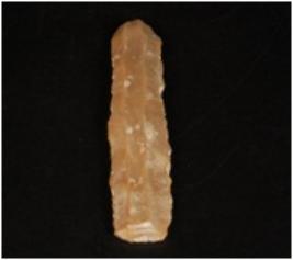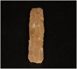 | Description / विवरण | Chert blade, double ridge on the dorsal, distal and proximal end is broken, use-ware marks along the cutting edge and trapezoidal in section. |