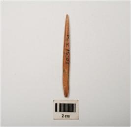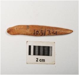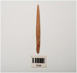 | Description / विवरण | Bone needle, polished and glossy surface with one pointed and one partly broken thick end, rectangular in section. |