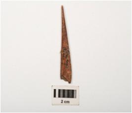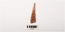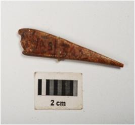 | Description / विवरण | Fragment of a bone point, polished surface with one pointed and one broad end rectangular in section, broken and mended and pointed one end. |
