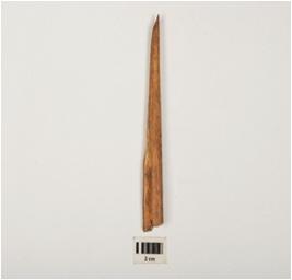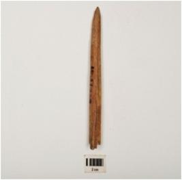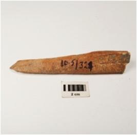 | Description / विवरण | Bone sphearhead, polished surface with cracks and a pointed end, partly broken from other thick end and triangular in section. |