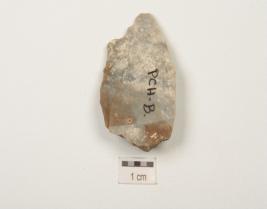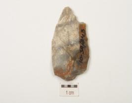 | Description / विवरण | Chert flake with prepared platform, flake scars on dorsal side and prominent bulb on ventral, use wear marks along cutting edges. |