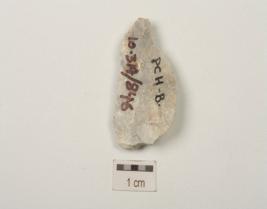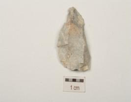 | Description / विवरण | Flake made on chert, with blade scars on dorsal side, diffused bulb on ventral and use wear marks along cutting edges. |