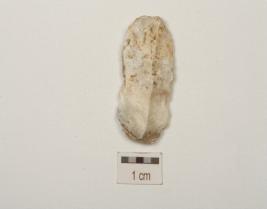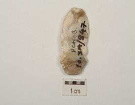 | Description / विवरण | Chert blade with striking platform, ridge on dorsal side and prominent bulb on ventral side, use wear marks along cutting edges and triangular in section. |