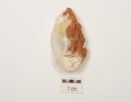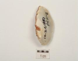 | Description / विवरण | Flake on chert with flake scars and cortex on dorsal and prominent bulb on ventral and use wear marks along cutting edge. |