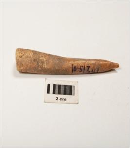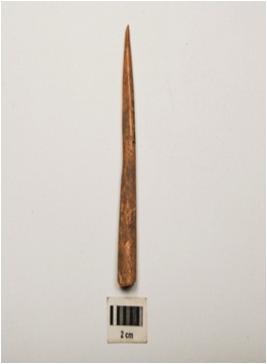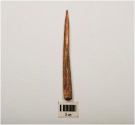 | Description / विवरण | Bone point, polished surface with one flat thick end, partly broken at pointed end and circular in section. |