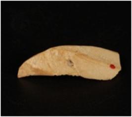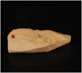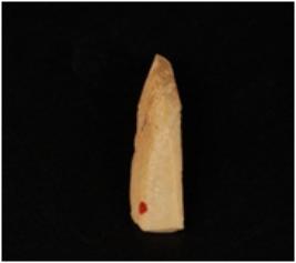 | Description / विवरण | Chert blade with a prominent mid ridge, pointed at one end and use-ware marks along the cutting edges. |