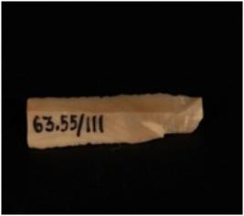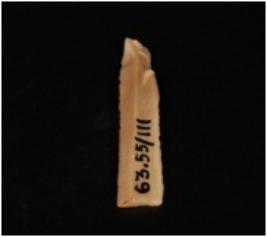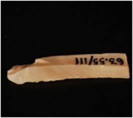| Description / विवरण | Chert blade with two ridges, trepezoidal in section and use-ware marks along the cutting edges. |