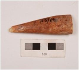 | Description / विवरण | A bone point, flat surface, one end is pointed, another end is flat and broken groove on surface, smooth surface and polished. |