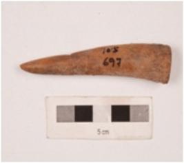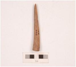 | Description / विवरण | A bone point, one end is pointed another end is round and thick, groove on surface, smooth surface and polished. |