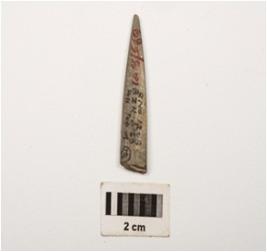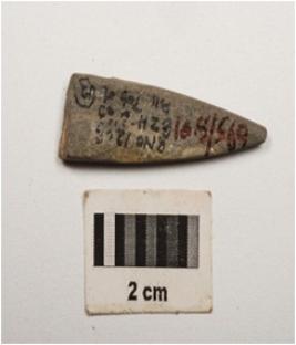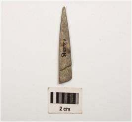 | Description / विवरण | A fragment of a point with rectangular cross section, made with himalayan soft stone, well polished surface, top is pointed and bottom is partly broken. |