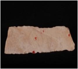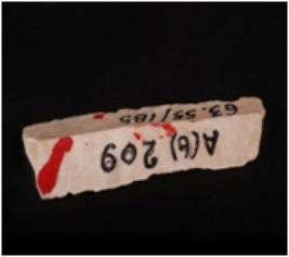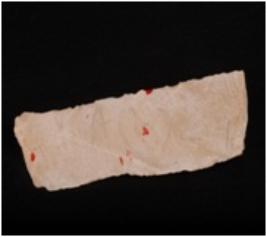 | Description / विवरण | Fragment of parallel sided chert blade with a prominent ridge on dorsal side and use-wear marks on cutting edges. |
