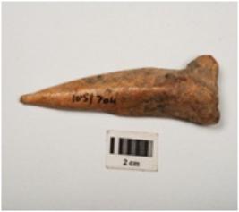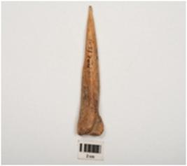 | Description / विवरण | Bone awl with polished surface, semi circular cross section, pointed at one end and flat at other end, one side is hollow. |