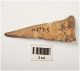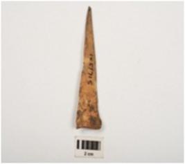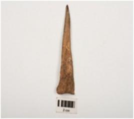 | Description / विवरण | Bone point with polished surface, flat cross section, pointed at one end and flat at other end. |