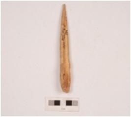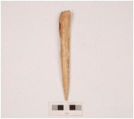 | Description / विवरण | A bone point, one end is pointed and broken, other end flat and one hole on end, cracks on surface, surface is smooth and polished. |