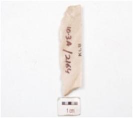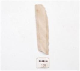 | Description / विवरण | Blade made of chert, trapezoidal in section, double ridge on dorsal and irregular marks on edges. |