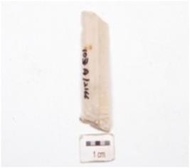 | Description / विवरण | Blade made on chert, trapezoidal in section, double ridge on dorsal and use marks on edges. |