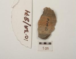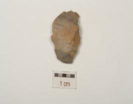 | Description / विवरण | Chert flake with flake scars on dorsal side and diffused bulb on ventral side and use marks along cutting edges. |
