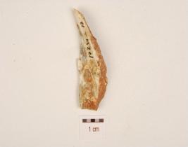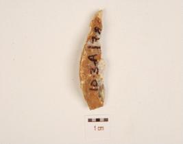 | Description / विवरण | A chert point, mid ridge on dorsal and use wear marks on cutting edge. |