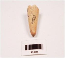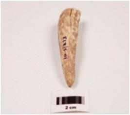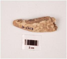 | Description / विवरण | A bone point, conical in shape, one end is pointed, cracks on surface, uneven and rough surface. |