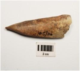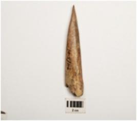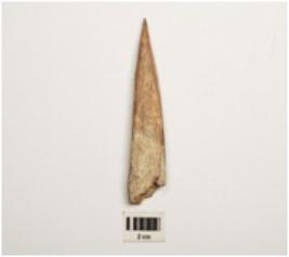 | Description / विवरण | A point made of bone, smoothly polished surface, a groove in the back side, pointed one end and other end broken. |