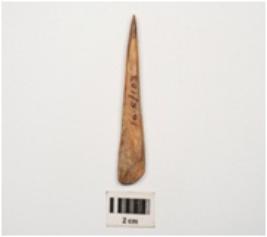 | Description / विवरण | A point made by bone, smoothly polished surface, one part pointed other broad base. |