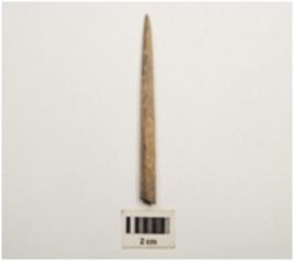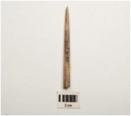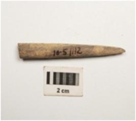 | Description / विवरण | Point made by bone, unpolished rough surface, slightly broken on the base part. |