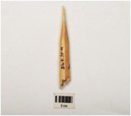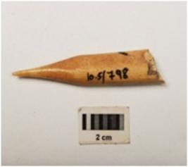 | Description / विवरण | A bone point made on a long bone, polished upper and lower surface. |